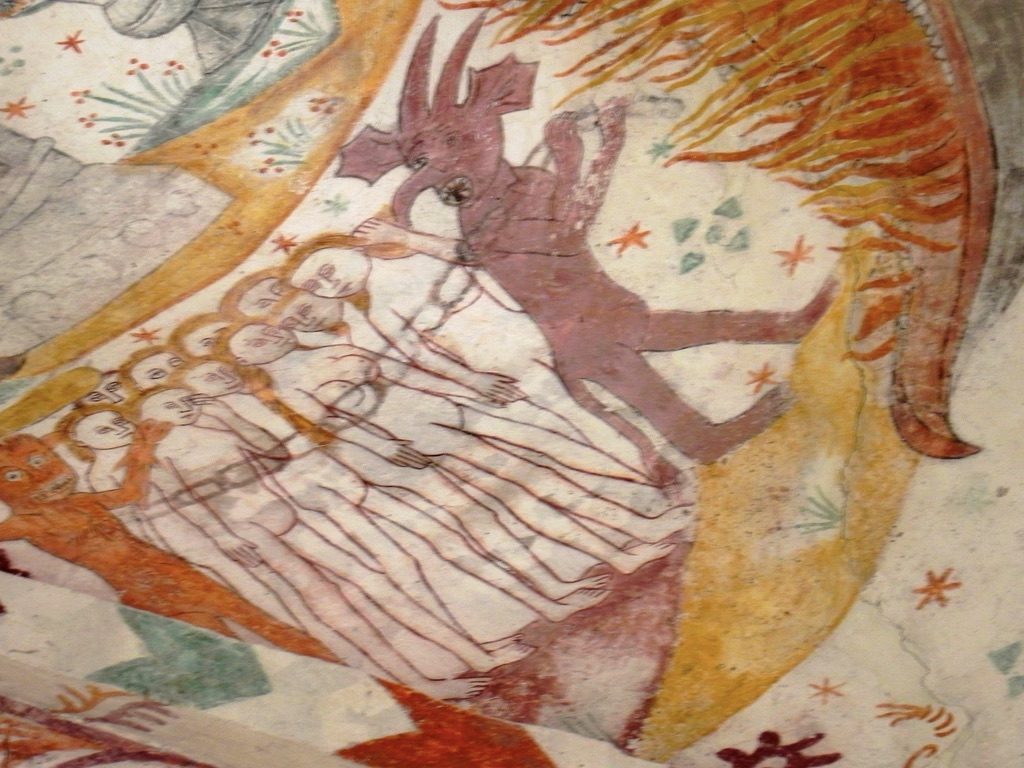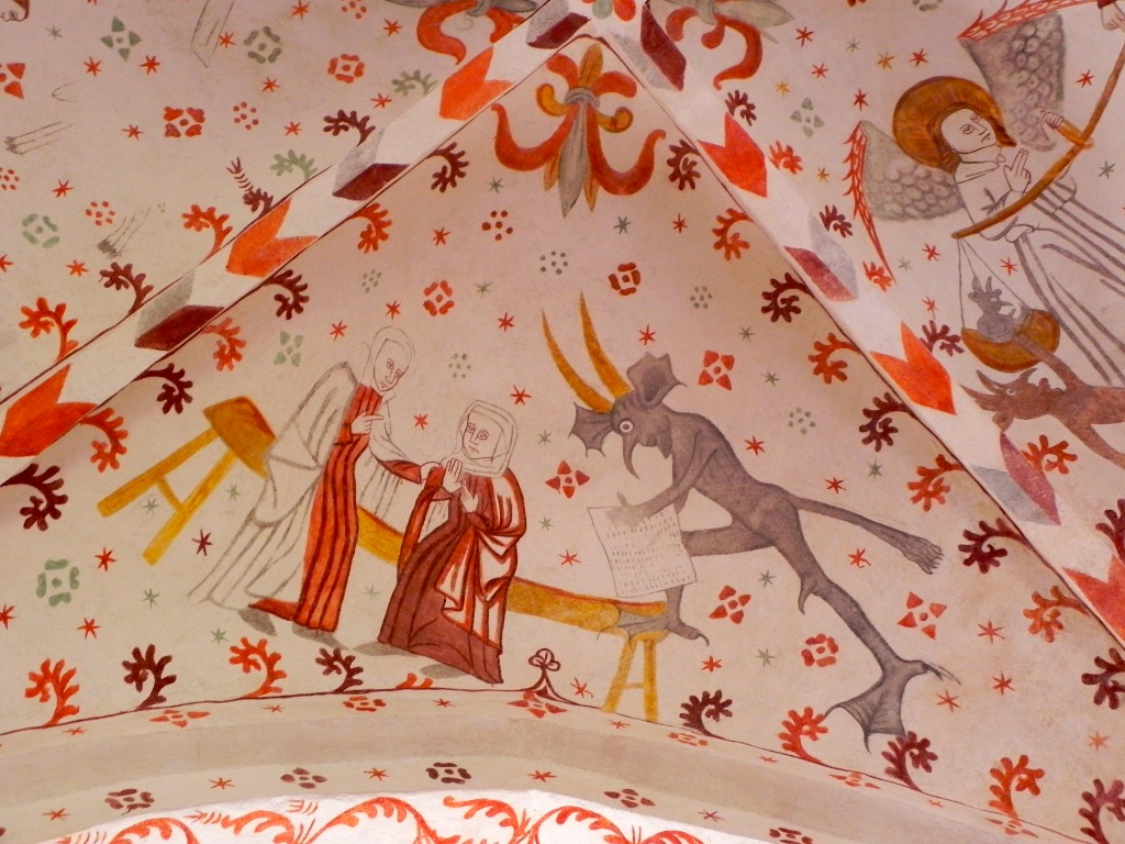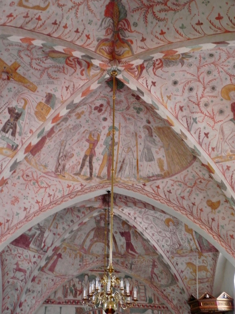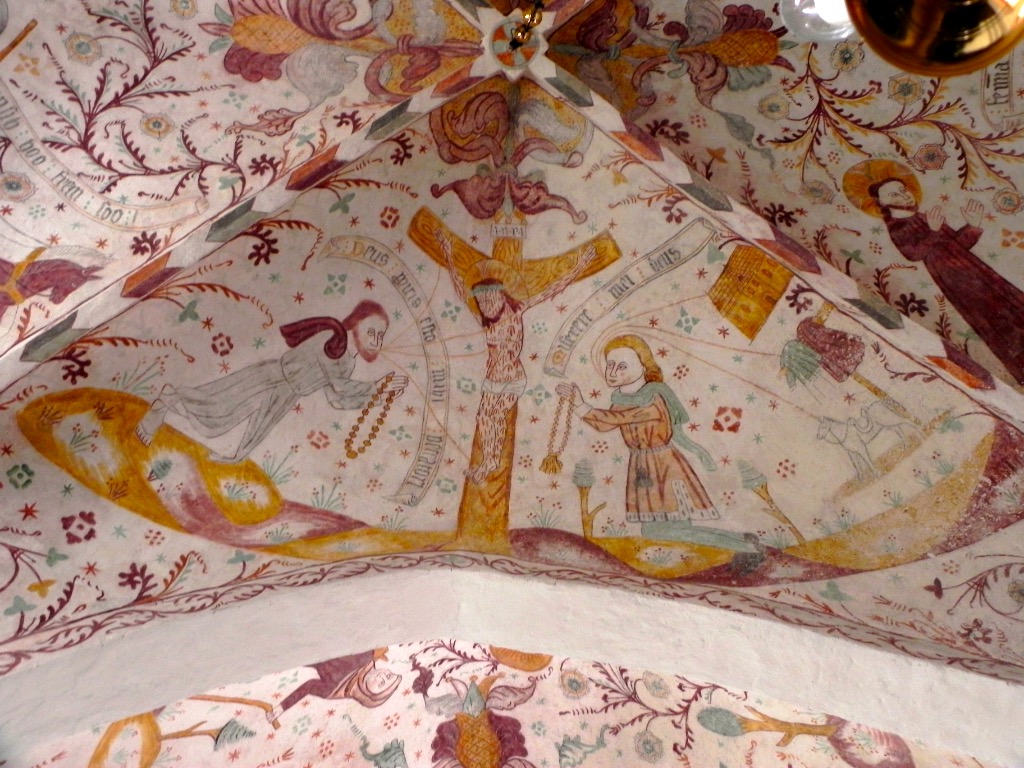 Il giorno dopo lasciamo il campeggio e visitiamo la chiesa di Fanefjord , con gli acquerelli del maestro di Elselund e, secondo la guida della “Lonely Planet”, la sua firma a forma di un uomo stilizzato con orecchie da coniglio. Alcune di queste “scenette bibliche” sono uniche: come quella dei diavoli intenti a strappare l’anima a Giuda, o dell’allegro demone dalle ginocchia cornute che ascolta i pettegolezzi di due signore, o quella di Maria che nel giorno del Giudizio fa inclinare la bilancia in favore dell’umanità.