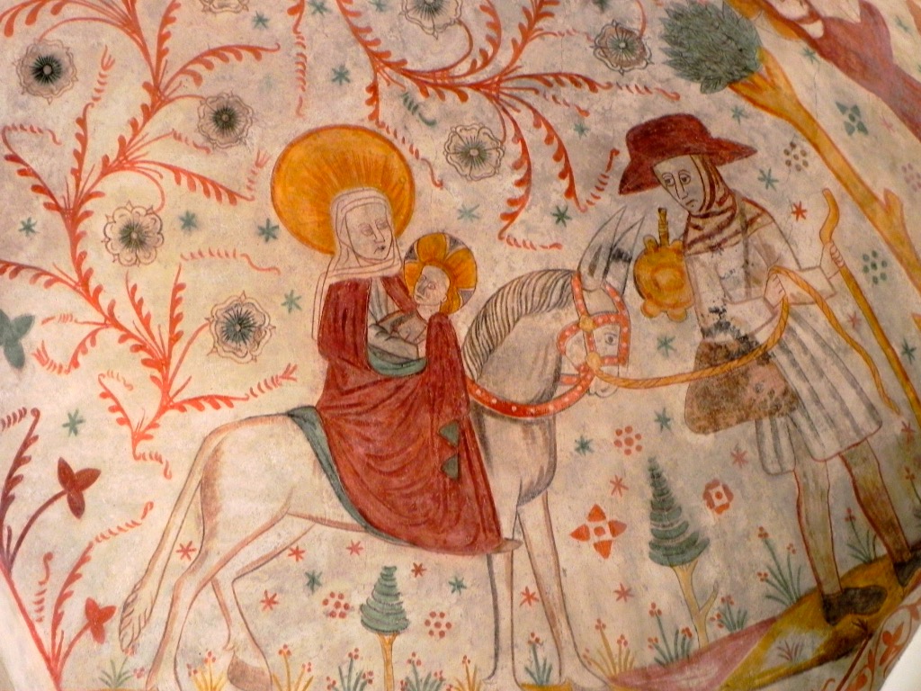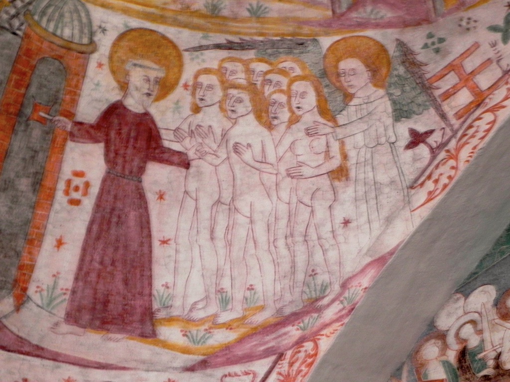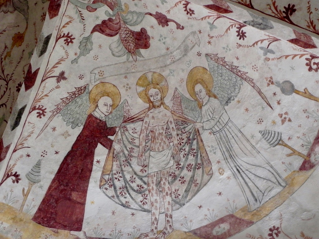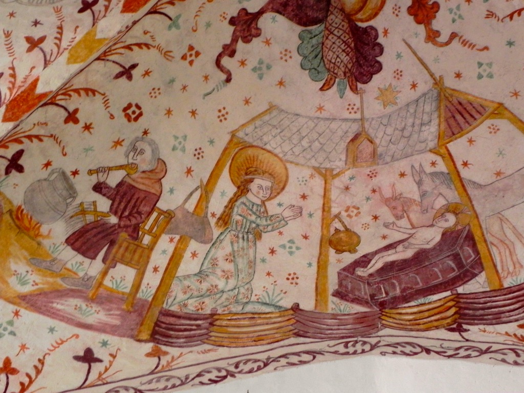 Il giorno dopo lasciamo il campeggio e visitiamo la chiesa di Fanefjord , con gli acquerelli del maestro di Elselund e, secondo la guida della “Lonely Planet”, la sua firma a forma di un uomo stilizzato con orecchie da coniglio. Alcune di queste “scenette bibliche” sono uniche: come quella dei diavoli intenti a strappare l’anima a Giuda, o dell’allegro demone dalle ginocchia cornute che ascolta i pettegolezzi di due signore, o quella di Maria che nel giorno del Giudizio fa inclinare la bilancia in favore dell’umanità.