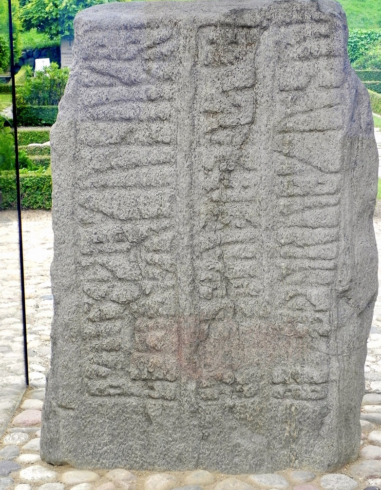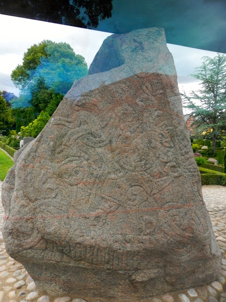 La tappa successiva è Jelling, con le sue due pietre con iscrizioni in alfabeto runico, che risalgono al X° secolo: la prima commissionata dal re Ghorm il Vecchio dedicata a sua moglie Thyra, mentre la seconda fu commissionata dal figlio di Ghorm e Thyra, Harald (Aroldo Dente Azzurro) in memoria dei propri genitori. In questa si può leggere “Harald, colui che riunì sotto il suo scettro Danimarca e Norvegia e che rese cristiani i danesi”, mentre nell’altra appare la prima rappresentazione di Cristo in Danimarca. Per questo le due pietre sono considerate una specie di certificato di nascita della Danimarca ed testimonianza della conversione dei vichinghi al cristianesimo. Da notare però che in quella di Harald viene mantenuta una decorazione a intreccio con animali mitici e motivi floreali e che pertanto dimostrano che siamo in un momento di transizione in cui il mondo guerriero, eroico e violento, che resterà nella mitologia e vivrà nella letteratura fantasy dei giorni nostri. Le due pietre runiche, unitamente alla semplice chiesa bianca in tufo, con i suoi interessanti affreschi ed una tomba vuota (conteneva i resti di Gorm e Thyra?; svuotata dal figlio Harald perché portò i resti nel cimitero della chiesa?) nonché i tumuli (quello fatto costruire da re Gorm per la regina Tyra misura 70 metri di diametro e 11 metri di altezza), sono Patrimonio dell’Umanità dal 1994.