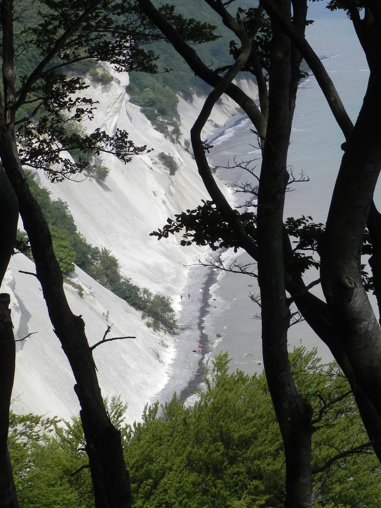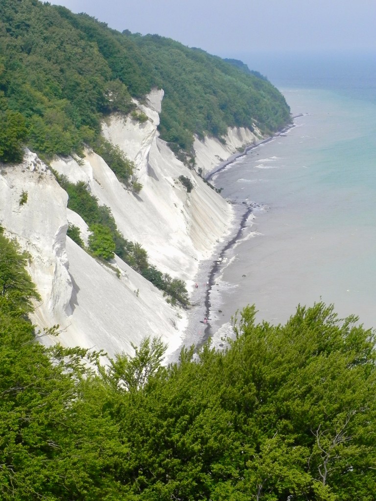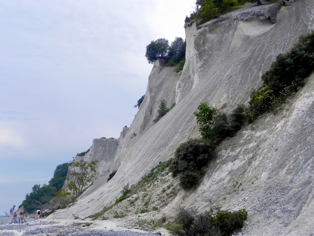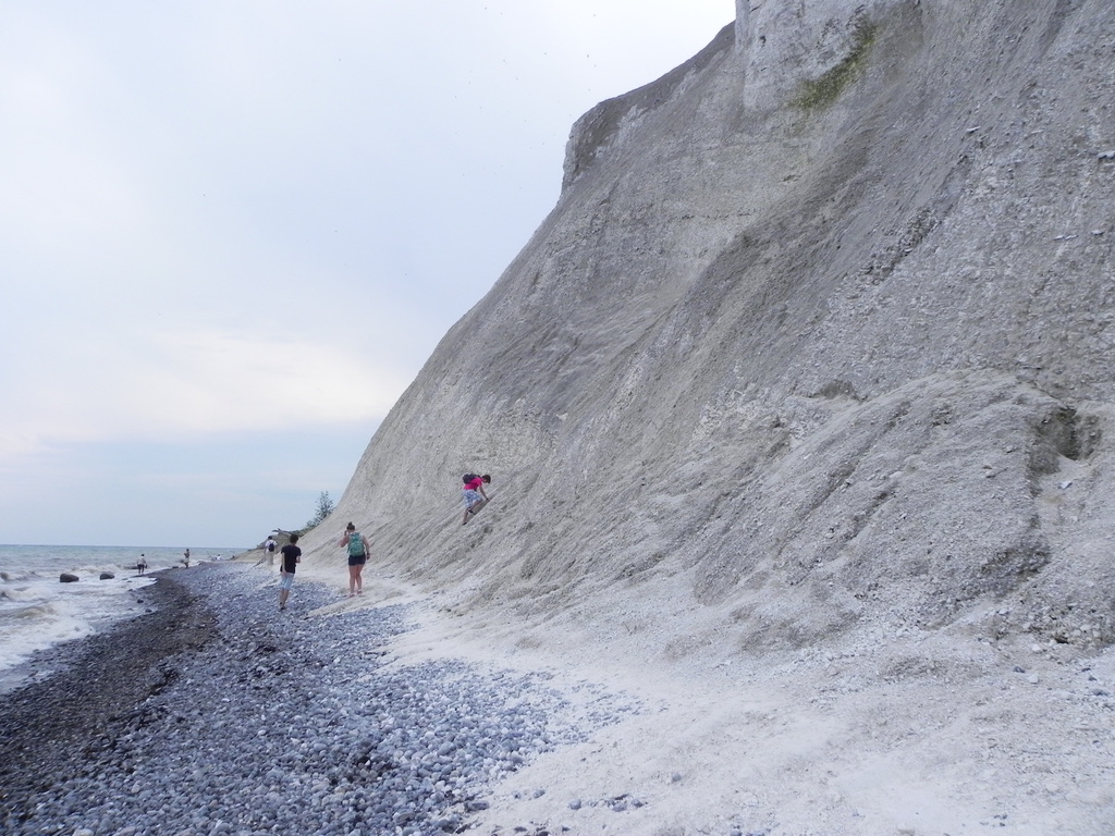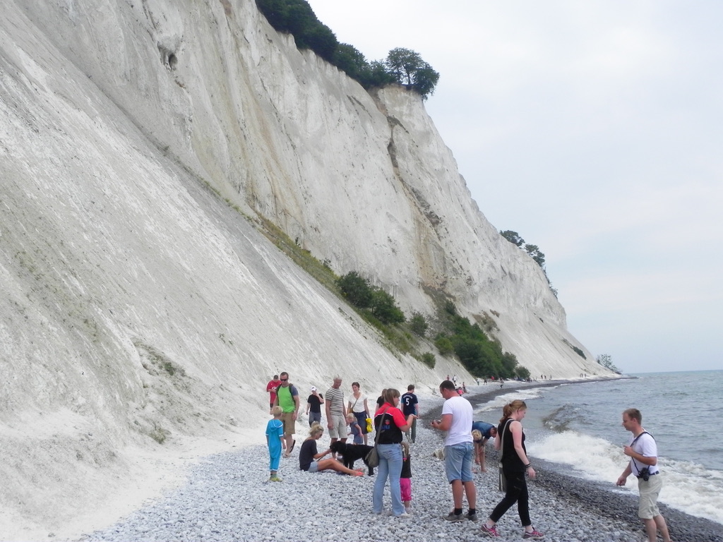 Dedichiamo il giorno successivo alla visita delle le scogliere bianche di Mons Klint. Dapprima facciamo una passeggiata lungo la zona boschiva sulle scogliere dalle quale si hanno delle splendide vedute delle scogliere stesse e del mare. Ritornati sui nostri passi raggiungiamo il GeoCenter Mons Klint, http://www.moensklint.dk, un moderno centro dove si può fare uno spuntino e avere informazioni scientifiche sulla zona e le scogliere. In prossimità del centro, c’è la scalinata in legno a picco sul mare (le scogliere sono alte circa 120 metri) che ci permette di raggiungere la spiaggia. Qui scopriamo che le bianche scogliere di gesso non sono così bianche come appaiono, ma hanno tonalità di arancione, di grigio nerastro a seguito della presenza di selce e di porpora. E, come tutti i turisti che hanno raggiunto la spiaggia, anche noi ci mettiamo alla ricerca di fossili del Cretaceo: e qualche frammento va ad arricchire i ricordi dei nostri viaggi sul camper.