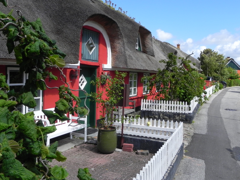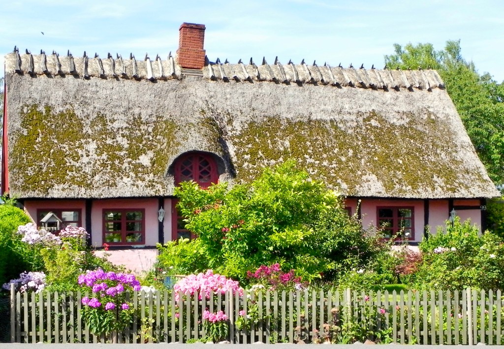 Un ponte abbastanza recente (1968) collega l’isola di Mon a quella di Nyord. C’è un unico villaggio con lo stesso nome dell’isola: le macchine non possono entrare (c’è un grande parcheggio all’ingresso dove lasciamo il camper) ed è un agglomerato di cottage dal tetto in paglia, con incantevoli giardini in fiore. Nel borgo ci sorprende il grande numero di rondini ed in effetti la piccola isola è un paradiso per il birdwatching.