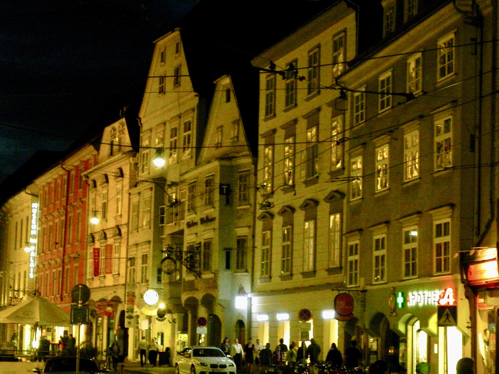 Passeggiamo senza una meta precisa nel centro storico. Poiché abbiamo un solo giorno, escludiamo i musei (è da ricordare che a Graz venne fondato l’Universalmuseum Joanneum nel 1811, il più antico museo austriaco, che ha ora numerose sedi nella città – la principale in Raubergasse – e in tutta la Stiria). Deliziati dallo stile della città, troviamo di grande interesse i seguenti siti: il Burg, quattrocentesco, sede del governo locale, famoso per la doppia scala a chiocciola del 1499 in Hofgasse; il Landhaus, in Herrengasse, l’antico palazzo della Dieta in stile rinascimentale; la Domkirche, in Burgasse 3, la cattedrale di Graz, con l’affresco, un po’ sbiadito, nella parete esterna che raffigura la città dopo tre flagelli dopo il 1480: l’arrivo dei turchi, la peste e l’invasione delle locuste; il Mausoleo di Ferdinando II, in Burgasse 3; il Rathaus (Municipio) in stile barocco nella Hauptplatz; Schossberg, l’altura di 473 metri (si sale o a piedi o con funicolare, con partenza da Kaiser-Franz-Josef-Kai, o con l’ascensore a vetro da Schloobergplatz) sulla quale venne costruita nel 1125 una fortezza da cui la città prende il nome (in sloveno gradec significa piccola fortezza) che fu poi rasa al suolo nel periodo napoleonico, e che ora è occupata da un parco, dai resti della fortezza, da un ristorante, un piccolo museo militare e, soprattutto, sul lato meridionale, dalla Torre dell’Orologio (Uhrturm), il simbolo della città.