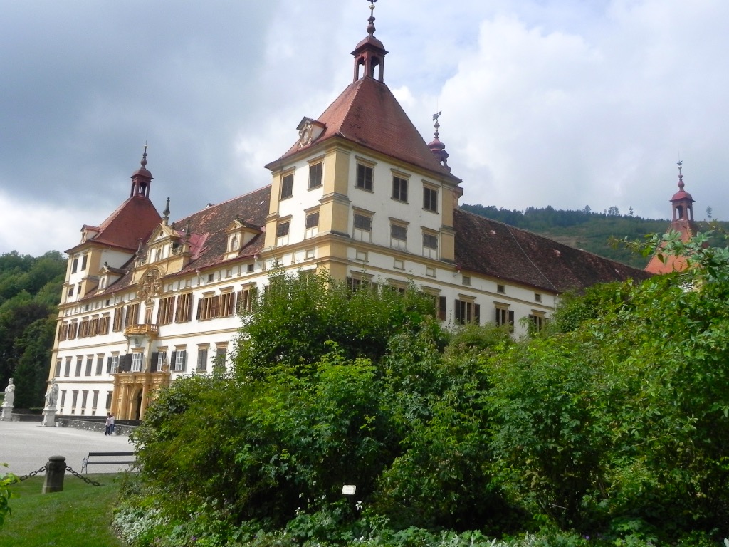 La mattina dopo, con il camper, ci spostiamo alla periferia di Graz in Eggenberg Allee, per visitare il castello di Eggenberg. E’ un bellissimo castello barocco, con numerosi elementi che richiamano lo stile rinascimentale italiano, commissionato dall’allora proprietario Ulrich Eggemberg per celebrare la sua nomina a governatore dell’Austria interna. Fu progettato dall’architetto Giovanni Pietro de Pomis, pittore ed architetto nato a Lodi ed al servizio dell’imperatore Ferdinando II (autore, tra l’altro, del Mausoleo in Graz). Partecipiamo alla visita guidata in inglese. E così abbiamo modo di conoscere numerosi aneddoti della famiglia Eggtemberg, di ammirare le 24 stanze di rappresentanza (Prunkraume), gli arredi, gli affreschi, e soprattutto di comprendere i numerosi simboli astronomici, i segni zodiacali e le scene tratte dalla mitologia classica che si trovano in tutto il castello e nel parco circostante. Lasciata la guida, continuiamo la nostra visita nell’Antica Galleria (Alte Galerie), dove i colori delle pareti sono stati scelti per valorizzare al meglio i quadri esposti ed il bel giardino (Schlossgarten).