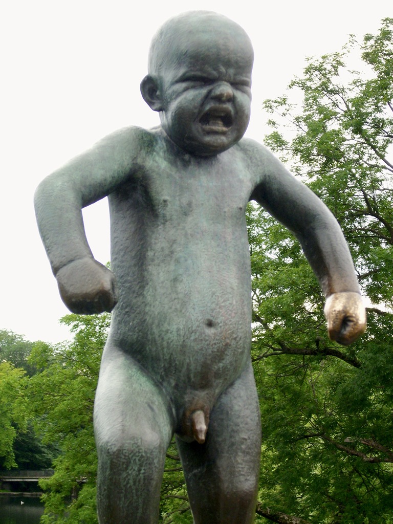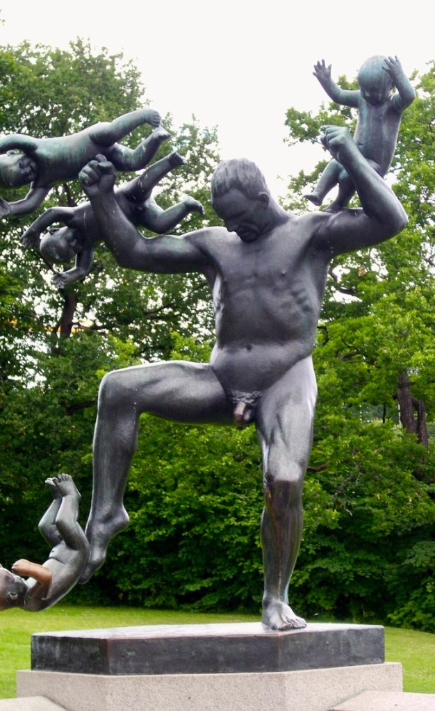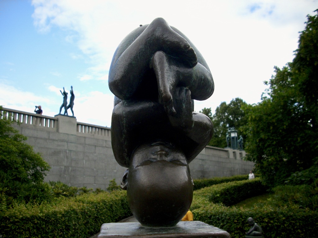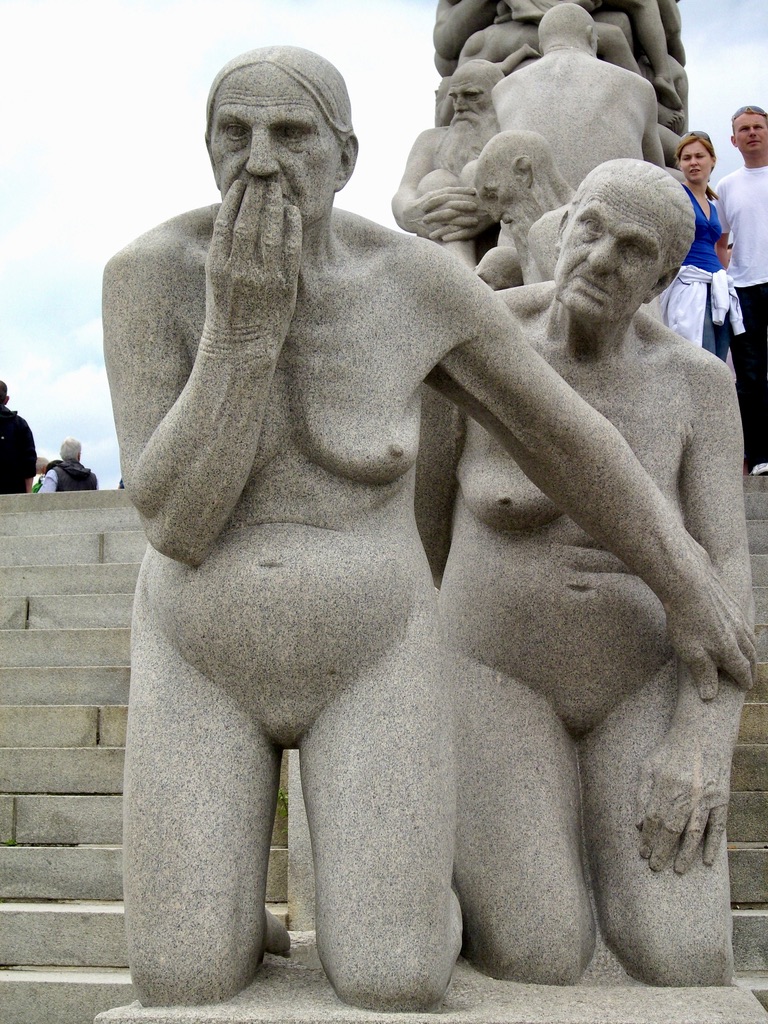 Dopo il pasto, prendiamo il tram 12 in direzione Frogner per visitare il Vigelandsparken. Come dice il nome è un parco e come tale presenta laghetti, vasti prati , ruscelli, alberi ombrosi che attirano gli abitanti di Oslo nelle belle giornate. Per noi invece è soprattutto un’esposizione all’aperto di 212 opere del grande scultore norvegese Gustav Vigeland, in bronzo ed in granito. Le emozioni sono tanti e di forte impatto sia che si ammiri le statue degli amanti abbracciati, dei mendicanti, degli anziani, dei bambini, sia che ci si trovi difronte al monolito di 14 metri, che svetta sulla sommità della collina del parco, che rappresenta 121 figure umane che si contorcono, si abbracciano e si ostacolano nella loro lotta per raggiungere la cima.