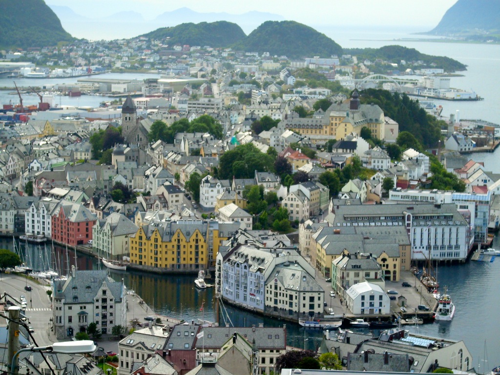 Visitiamo il centro della città che si sviluppa su una penisola a forma di amo. Ci sono molto edifici in stile art nouveau continentale e con ornamenti e motivi della tradizione norvegese conseguenza della ristrutturazione seguita al devastante incendio che colpì Alesund il 23 gennaio 1904 e alla quale parteciparono l’imperatore Guglielmo II di Germania, che spedì navi cariche di provviste e materiali edili, ed un gruppo di giovani architetti norvegesi di formazione germanica. Questi edifici possono essere ammirati sopratutto nella via Kongensgata. Tralasciamo i musei, un po’ perché defilati rispetto al centro un po’ perché il tempo a disposizione non ce lo permette, mentre ci impegnano a salire i 418 scalini sulla collina di Aksla per raggiungere il belvedere di Kniven, da cui si può avere una bella panoramica della città e delle isole che la circondano.