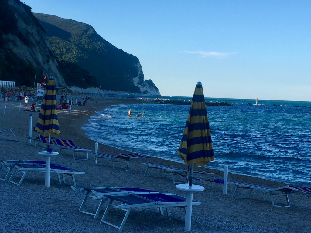 Gran parte del giorno dopo l’abbiamo trascorsa camminando lungo questa parte del litorale: dal porto di Numana abbiamo raggiunto la spiaggia, ma poiché camminare sulla ghiaia è risultato difficile ci siamo quasi subito spostati sul marciapiede. E così siamo arrivati in fondo (quasi cinque chilometri) alla spiaggia di Marcelli dove la spiaggia libera prende il posto degli stabilimenti. Che dire di questa parte del litorale? A noi è sembrato il posto ideale per un turismo famigliare organizzato con stabilimenti balneari, appartamenti estivi in affitto, alberghi ristoranti e negozi. Con purtroppo anche qualche scempio urbanistico come un grande villaggio (?) costruito per metà ed in abbandono. Però sopra a tutto ci sono il bel mare e sempre sullo sfondo il Conero.