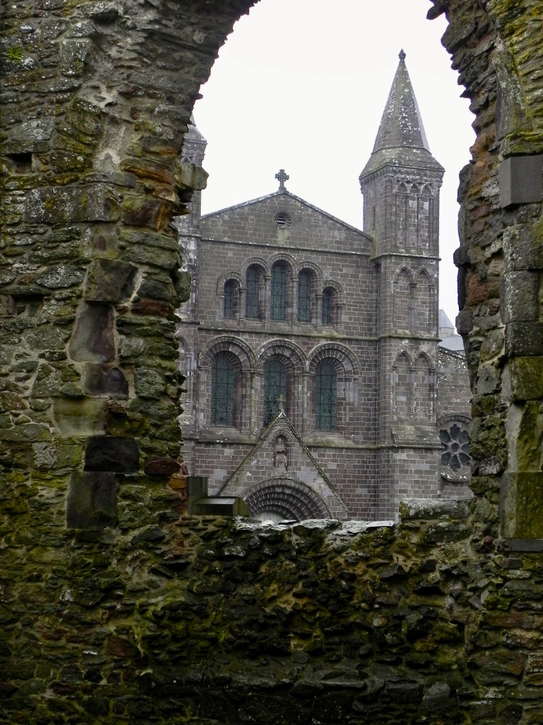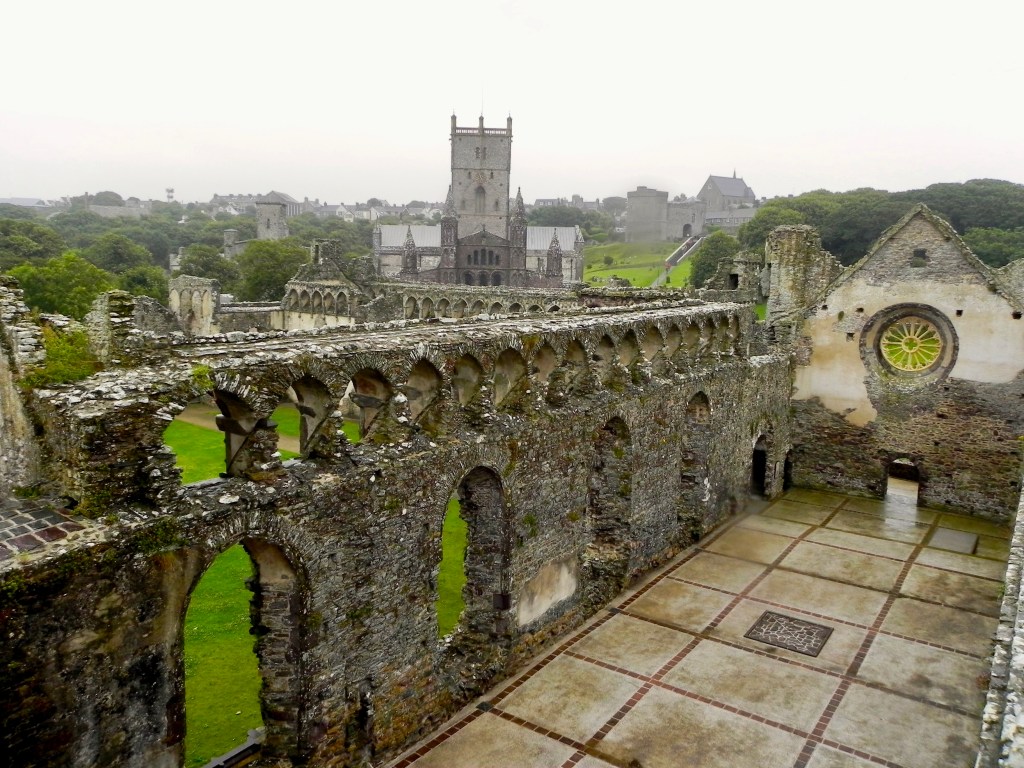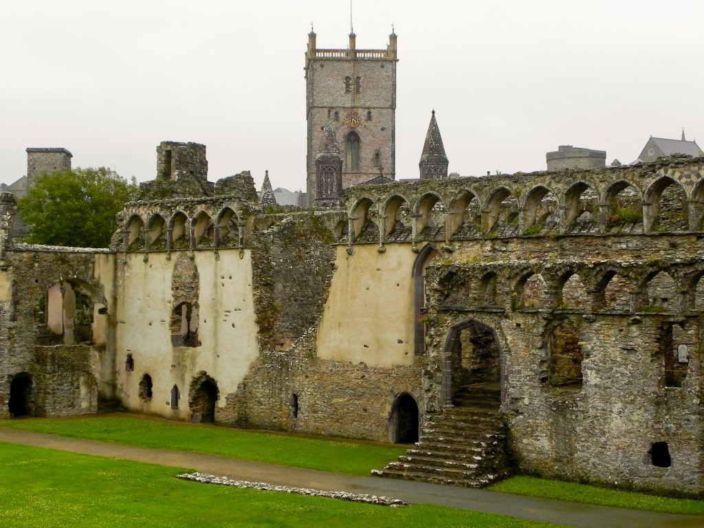 La Cattedrale (Eglwys Gadeiriol Tyddewi) ed il Bishop’s Palace (Llys yr Esgob Tyddewi) sono i due luoghi in cui si materializza la dimensione religiosa del luogo. Alla cattedrale si entra da una porta di ingresso che dà sul recinto. Da qui si ha una completa vista della cattedrale: costruita tra il XII° e XIV° secolo, è imponente, massiccia, in pietra di diversi colori (anche perché subisce l’azione dei licheni), e l’impressione che se ne ricava è che sembra più una fortezza che una chiesa (venne costruita su una preesistente cappella del VI° con l’obiettivo di nasconderla dagli eventuali predatori vichinghi che però non si realizzò perché fu più volte saccheggiata). Un altro problema della Cattedrale è stata l’instabilità del terreno: ci furono dei lavori di restauro nel XIX° secolo (risale a quel periodo la facciata occidentale), ma entrando nella navata (una parte molto antica) si notano subito la pendenza del pavimento e l’inclinazione delle belle colonne di pietra. All’interno, assolutamente da ammirare sono: il soffitto intagliato della navata; il pulpito con la statua di St David; il coro con le curiose immagini intagliate sugli stalli; la torre del lucernario, dai colori vivaci; la Holy Trinity Chapel, luogo di coronamento dei pellegrinaggi, perché in un cofanetto di quercia sono contenute le ossa di St David (e di san Giustiniano).
