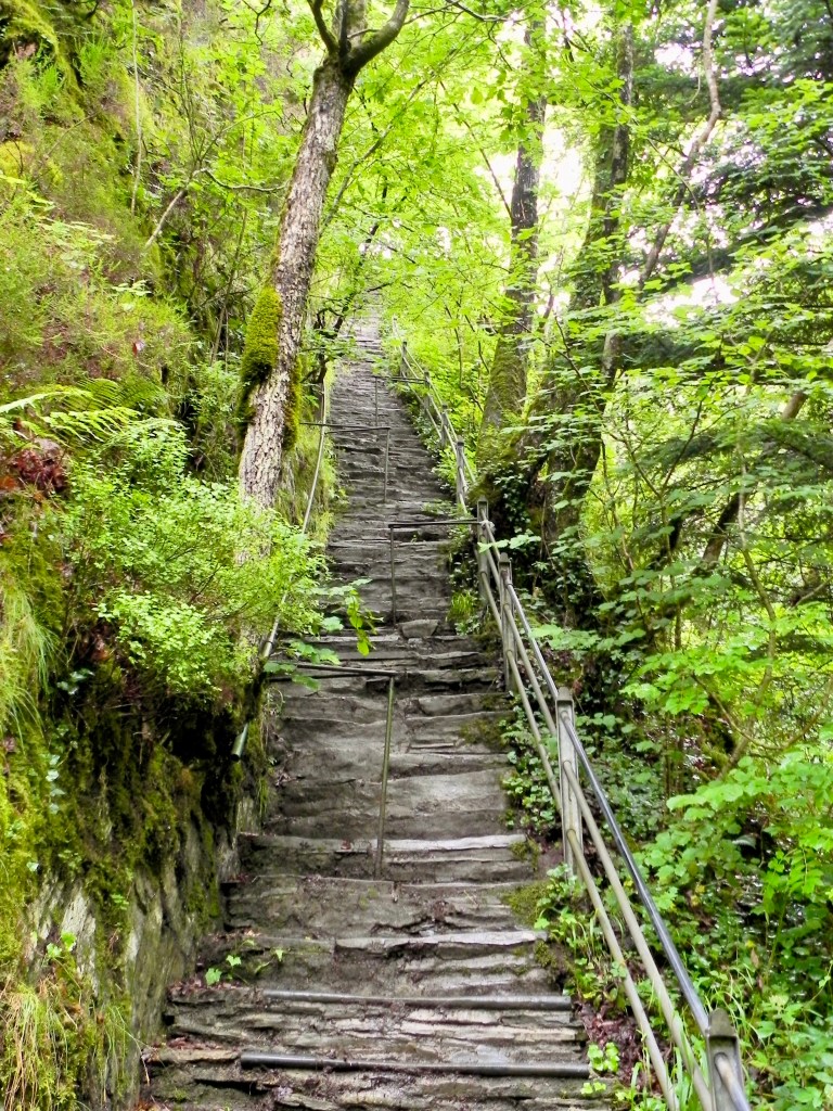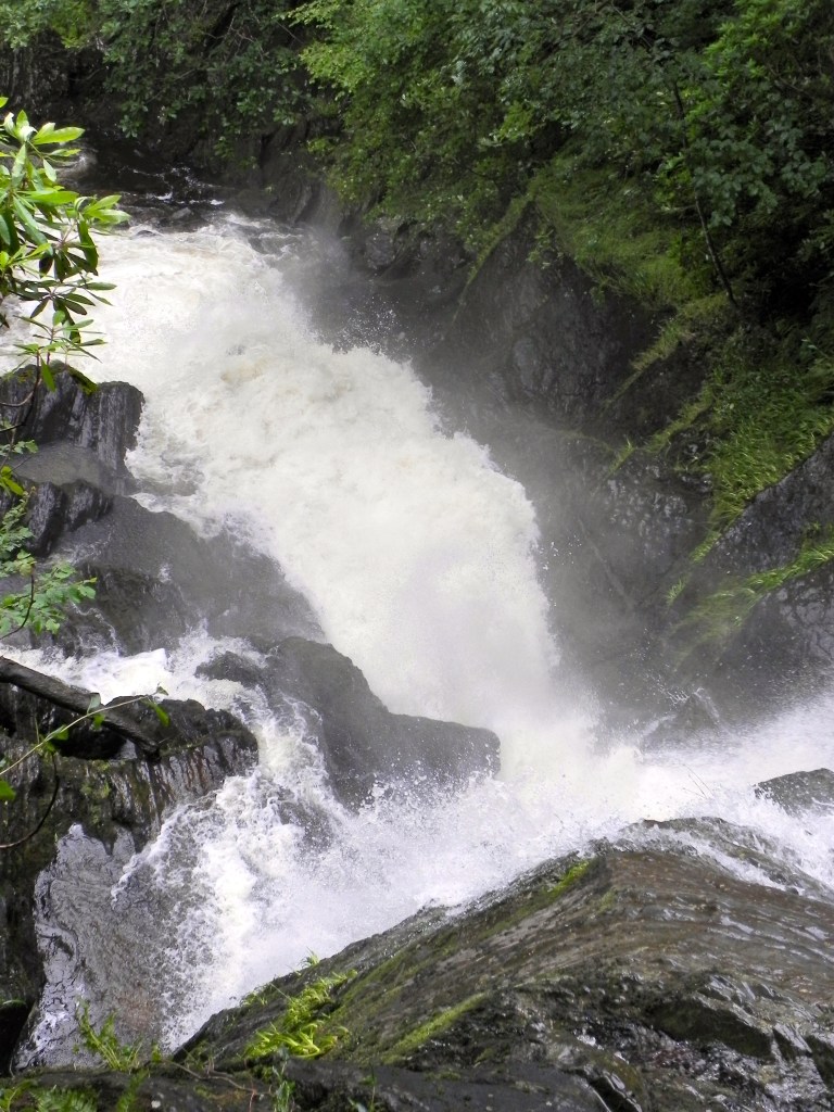 La giornata continua con la visita al villaggio di Devil’s Bridge che si trova nella Rheidol Vale. Qui tutto è altamente scenografico: due impetuosi fiumi, Mynach e Rheidol, confluiscono in un’unica gola. Il primo è attraversato da tre ponti in pietra, il più antico dei quali risale attorno all’anno 1000, mentre il secondo, proprio sopra alla confluenza, precipita per un centinaio di metri formando spettacolari cascate. Ci sono due passeggiate per ammirare la natura: una di circa 10 minuti che permette di vedere i tre ponti ed una circolare, di circa mezz’ora con però la discesa di cento gradini (la Jacob’s scale, la scala di Giacobbe), che attraversa il Mynach e risale dall’altra parte. Noi scegliamo la seconda ed il cream tea gustato nel coffee shop al termine della passeggiata ci ritempra dalle fatiche e dall’umidità al momento giusto.