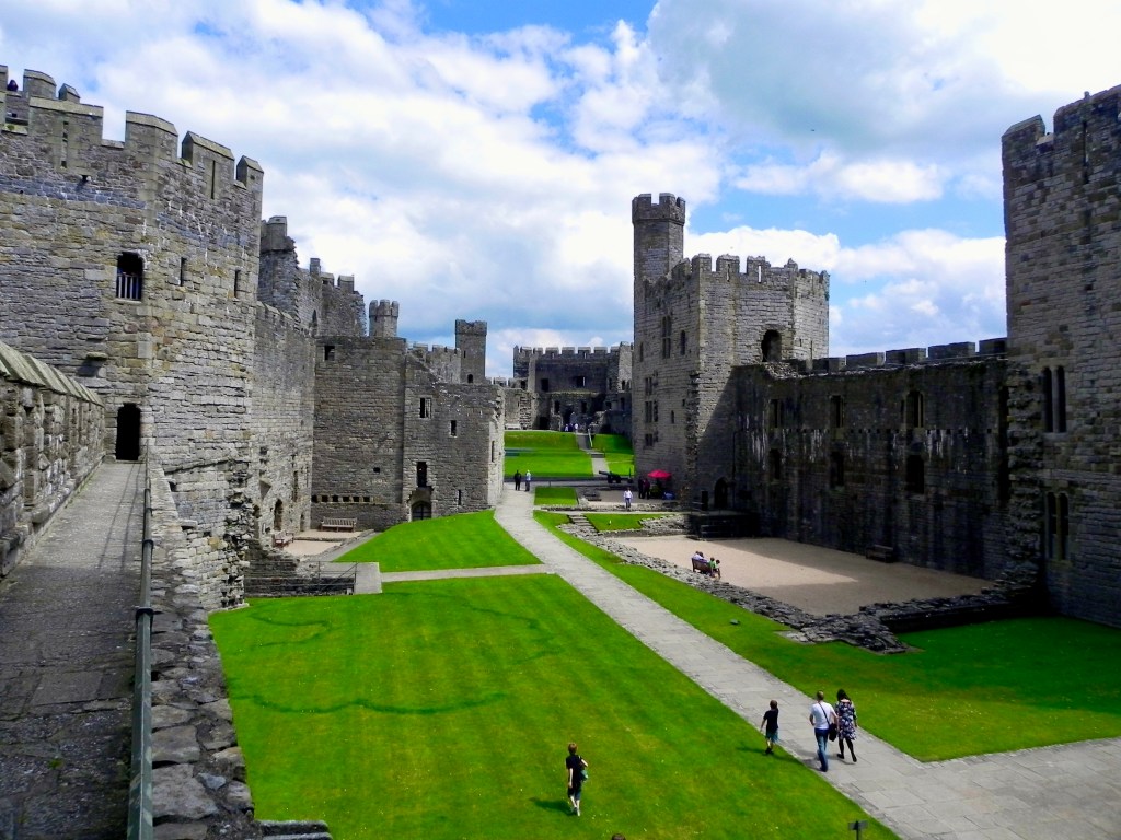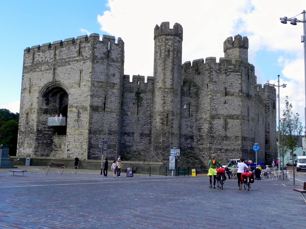 Attraversiamo il parco lungo una bella strada panoramica che ci conduce a Caenarfon. Facciamo una breve visita del villaggio, ma è soprattutto il castello il motivo della nostra sosta. Per la fedele guida della “Lonely Planet” è uno dei castelli medievali più importanti del mondo”. Fu costruito come fortificazione militare, sede di governo e residenza reale su, molto probabilmente, ispirazione delle mura di Costantinopoli. Di qui la presenza di torri poligonali al posto di quelle circolari con torrette, tutte fornite di sistema di botole per difendersi dal nemico (cedette solo all’attacco delle truppe di Cromwell nel 1646, ai tempi della Rivoluzione borghese). Delle torri ricordiamo la Eagle Tower, per la le sue statue di pietra con elmi progettate per ingannare gli assalitori.