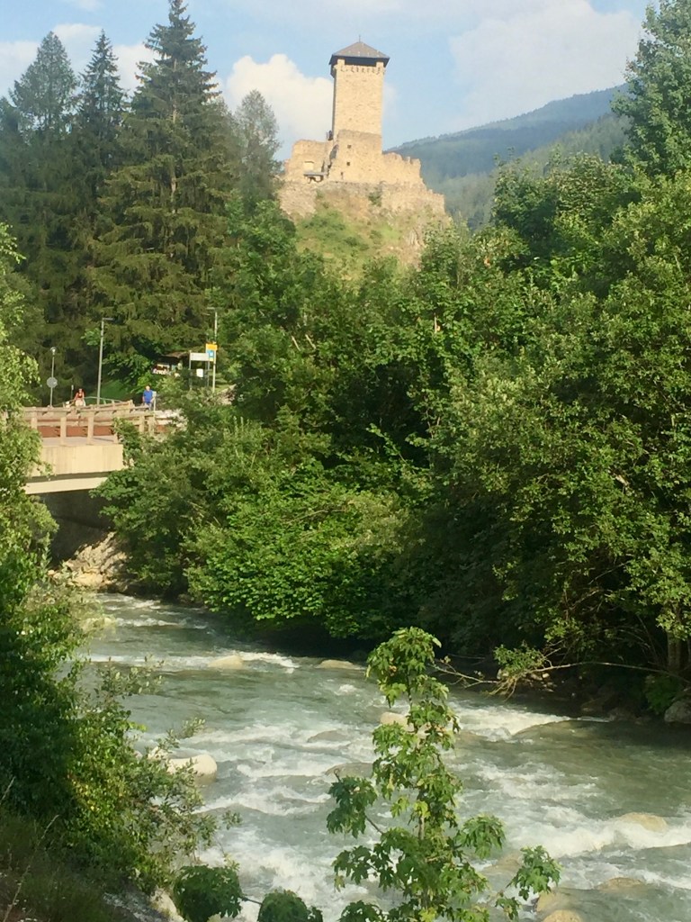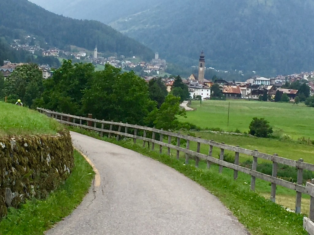 Lo trascorriamo in bicicletta perché percorriamo la parte centrale o “valle bassa” della pista ciclabile che attraversa la Val di Sole che si sviluppa da Ossana a Malé. Dal depliant dell’Azienda per il Turismo della Val di Sole che abbiamo trovato alla reception del campeggio: “Pisa ciclabile easy … si sviluppa quasi per intero lungo il percorso del fiume Noce per 35 km da Cogolo di Pejo fino a Mostizzolo ricalcando il tracciato di antiche strade di collegamento o di strade arginali e di campagna. Il percorso non è impegnativo e copre un dislivello complessivo di 565 metri. Si possono scegliere vari percorsi, utilizzare il treno Dolomiti Express (servizio Bike Train/Bus) organizzato per il trasporto delle bici per integrare più itinerari o risalire comodamente dal fondovalle.” La parte che noi abbiamo fatto, tutta asfaltata, è composta da tratti pianeggianti a lievi discese, offre belle vedute sul fiume Noce (spesso percorso da canoe e gommoni impegnati in gare e/o spericolate discese lungo le rapide del fiume) e dei prati attorno, e da Daolana (a proposito: questo comune come tutta la valle sono un grande territorio per gli amanti della mountain bike) a Malé “è probabilmente il tratto più semplice di tutta la ciclabile” (citato dal depliant).