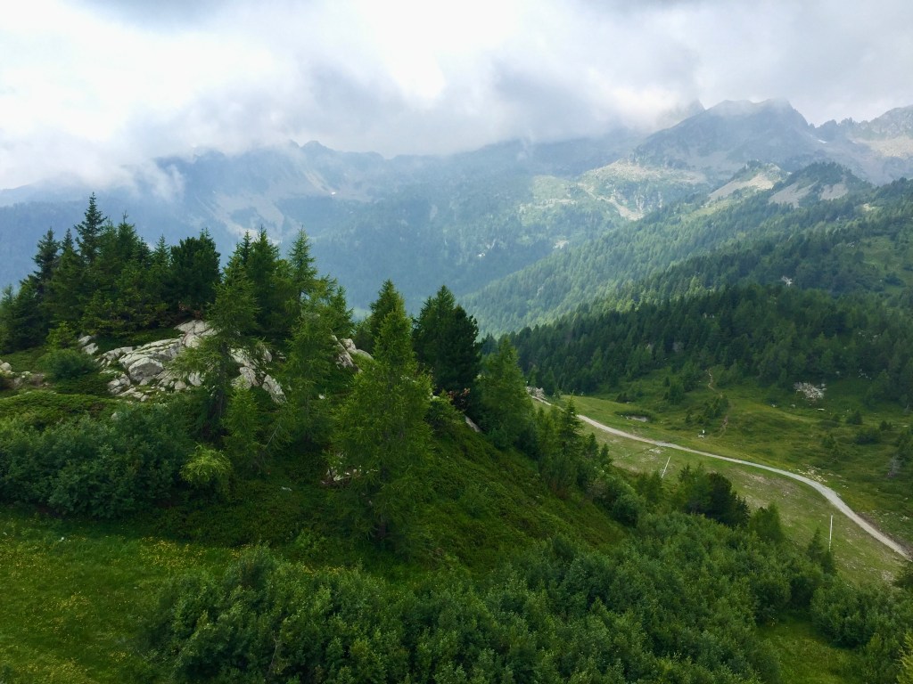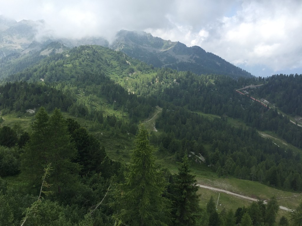 Iniziamo la discesa a piedi perché vogliamo arrivare alla stazione intermedia della cabinovia. Però manchiamo il cartello, un funzionario della cabinovia che incontriamo lungo il sentiero ci dà un’indicazione sbagliata, noi non ci fidiamo di percorrere un sentiero dove compare l’indicazione “zona di presenza dell’orso bruno”. Conclusione: per più di sei chilometri camminiamo in discesa sulla strada provinciale che ci conduce a Marilleva 900, da dove prendiamo il treno per ritornare al campeggio.
