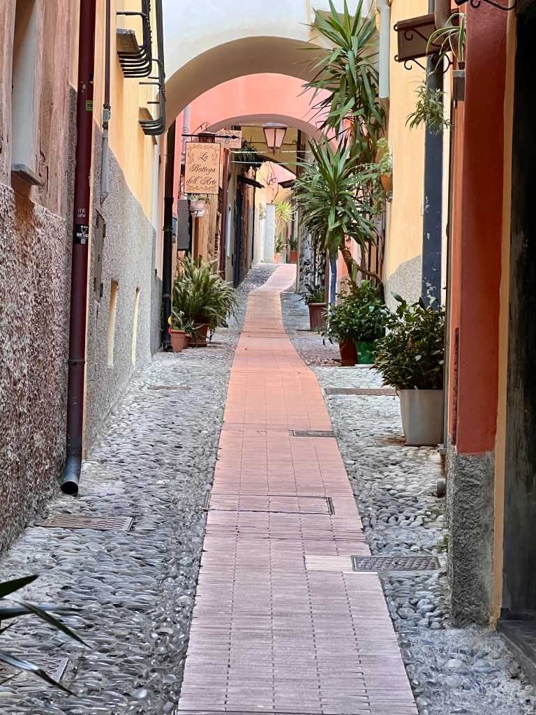 Ed il nostro desiderio di percorrere qualche chilometro in bicicletta nella bella terra di Liguria? C’erano ancora tante ore prima del nostro rientro (i mercatini siamo soliti visitarli alla mattina presto e fortunatamente Il Caffè del Caprice apre in un momento imprecisato tra le 6,28 e 6,30 …) e allora: “perché no Cervo?”. Montati sulle nostre biciclette, un po’ sulla via Aurelia ed un po’ sul lungomare di San Bartolomeo al Mare, abbiamo raggiunto, in men che non si dica (sono circa cinque i chilometri che lo separano da Diano Marina), il bello ed antico Cervo, uno dei “Borghi d’Italia” più belli.