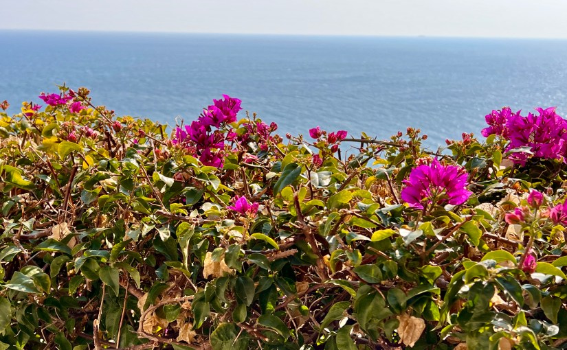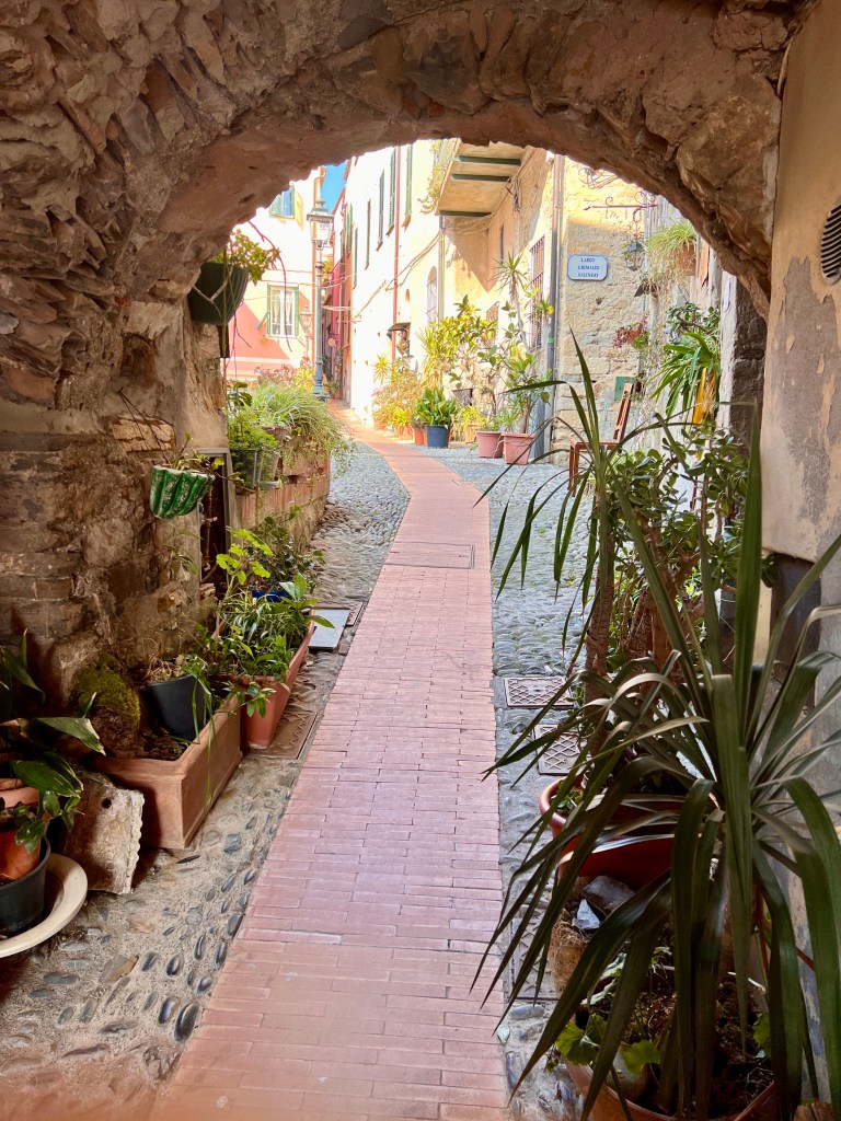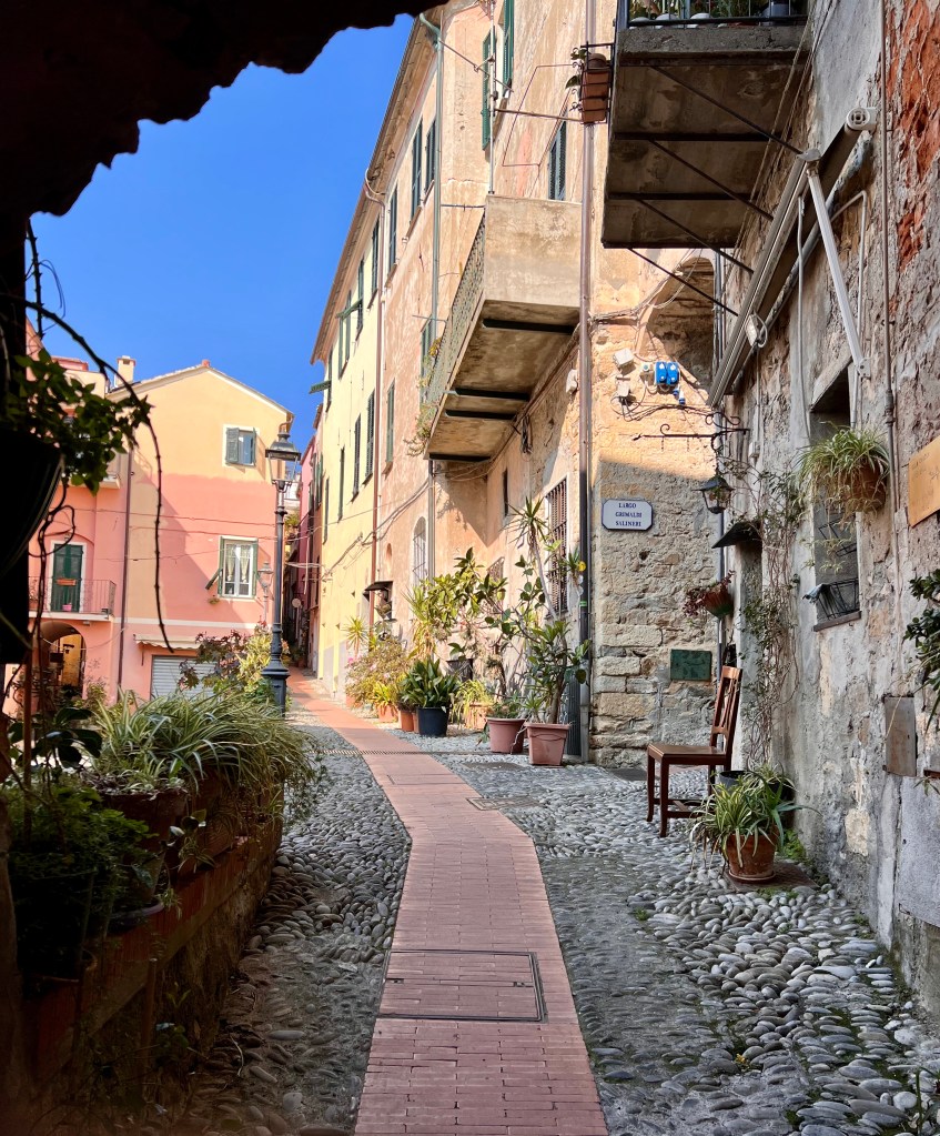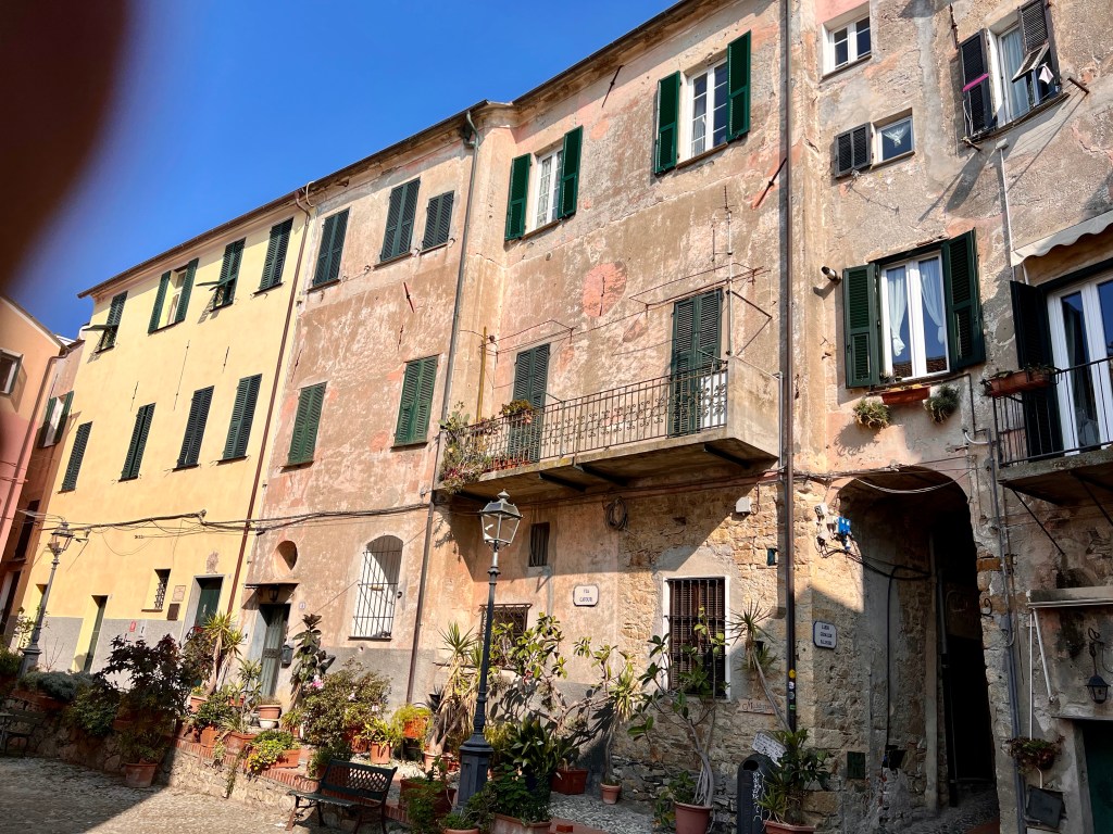 Una volta arrivati, abbiamo lasciato le biciclette in uno dei parcheggi all’ingresso del paese ed a piedi abbiamo seguito gli stretti vicoli dell’impianto medievale del suo centro storico che dal mare salgono verso la chiesa barocca di San Giovanni Battista (o dei Corallini perché la sua costruzione fu finanziata grazie ai proventi della pesca del corallo) e piazza Santa Caterina con il Castello dei Clavesana, costruito nel XVII° secolo e ora sede del Museo Etnografico. E così vedute dell’azzurro mare da una parte, bellissimi scorci tra le vecchie case color pastello e qualche angolo per riflettere hanno reso molto bella la visita. Non poteva non mancare una piccola sosta per un veloce pranzo: al Caffè del Castello, nella suggestiva piazza Santa Caterina, con delle abbondanti, gustose e ben cucinate pinse romane.