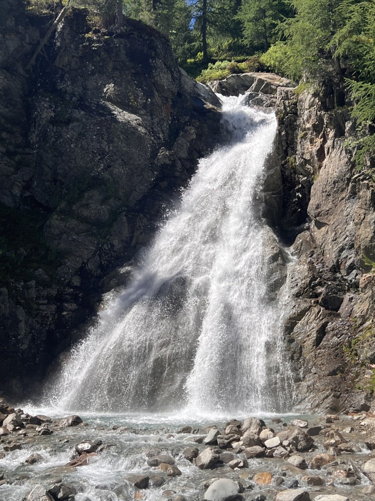 Dopo aver lasciato le biciclette alla malga, abbiamo preso il sentiero (cartello n.114 Casc’chéda da Val Néira) che inizia a destra della malga e che si addentra nel bosco tra alcune placide mucche all’inizio, la ricca vegetazione, i fiori, le vedute delle montagne un po’ innevate in lontananza ed il torrente in fondo alle valle. Il sentiero è facile, c’è qualche tratto in cui sale ma la pendenza è abbastanza morbida e così giungiamo nel punto in cui siamo sopra alla cascata. Per arrivare alla sua base, dobbiamo scendere dei gradoni e lo spettacolo che abbiamo una volta scesi è davvero bello, con l’acqua, impetuosa e limpida, che compie un salto di una decina di metri. L’acqua della cascata si unisce a quella che scende dalla montagna e per superare il torrente che si forma superiamo un ponte tibetano. Risaliamo i gradoni che a questo punto ci portano sulla strada del ritorno (il sentiero si sviluppa ad anello). Ora il sentiero è pianeggiante ed in discesa, ci offre altre belle vedute della cascata e tra prati in fiore, mucche e cavalli ritorniamo alla malga e ci ritempriamo con i loro piatti.